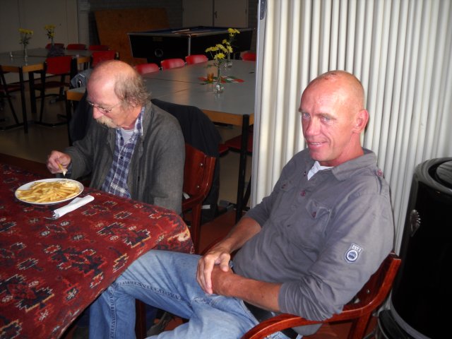 Iets wat nog nooit eerder was gebeurd, Dick K was trots, erg trots, dat hij deze bestelling mocht aannemen. Beiden wilden wel op de foto (zoals hier te zien). Geurt verklaarde na afloop, dat hij nog nooit zo’ n lekker patatje-met had gegeten in het dorpshuis.